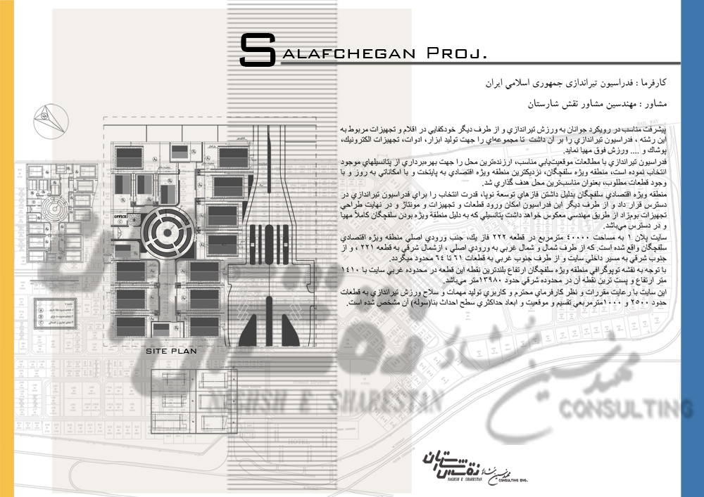 The Iranian Shooting Federation, in order to localize and produce electronic equipment and halls, as well as sports weapons, rifles, etc., introduced two plots of land for the design of the relevant factories to Naghsh Sharestan Consulting Engineers, and this consultant designed the landscaping and spatial location. Procure each of the production factories in the mentioned sites and submit them to the approval of the relevant authorities.
