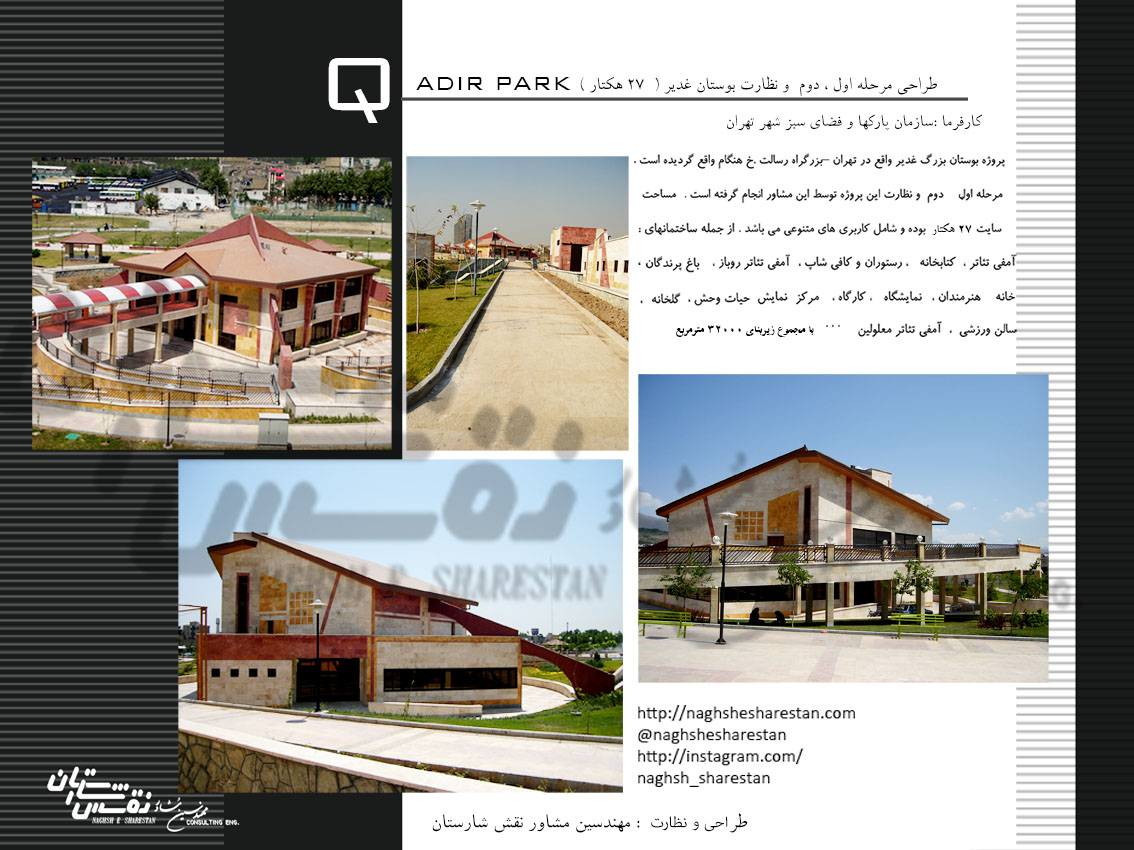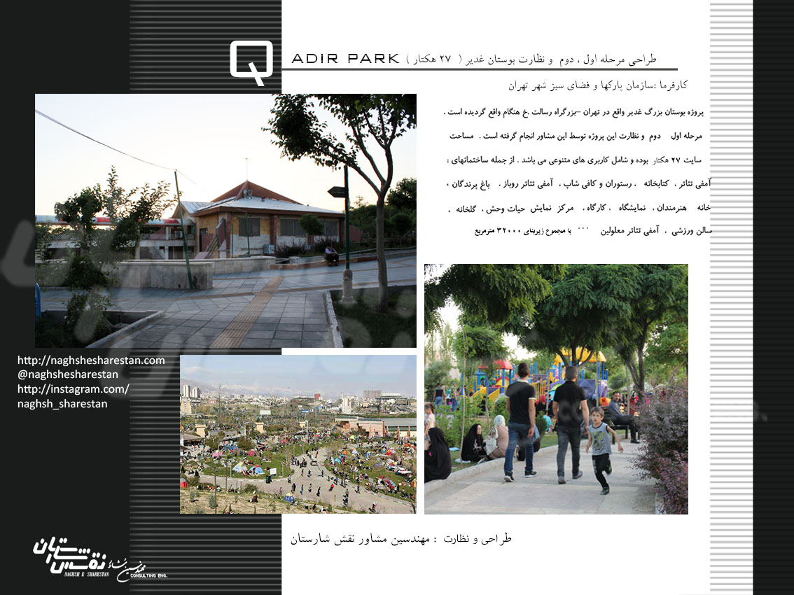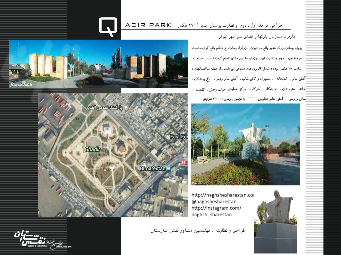 Tehran Parks and Green Space Organization entrusted the design of Ghadir 27-hectare park in District 4 of Tehran Municipality and in the parking lot of Vahed Company, next to Al-Ghadir Resalat Square in Tehran, to Naghsh Sharestan Consulting Engineers.