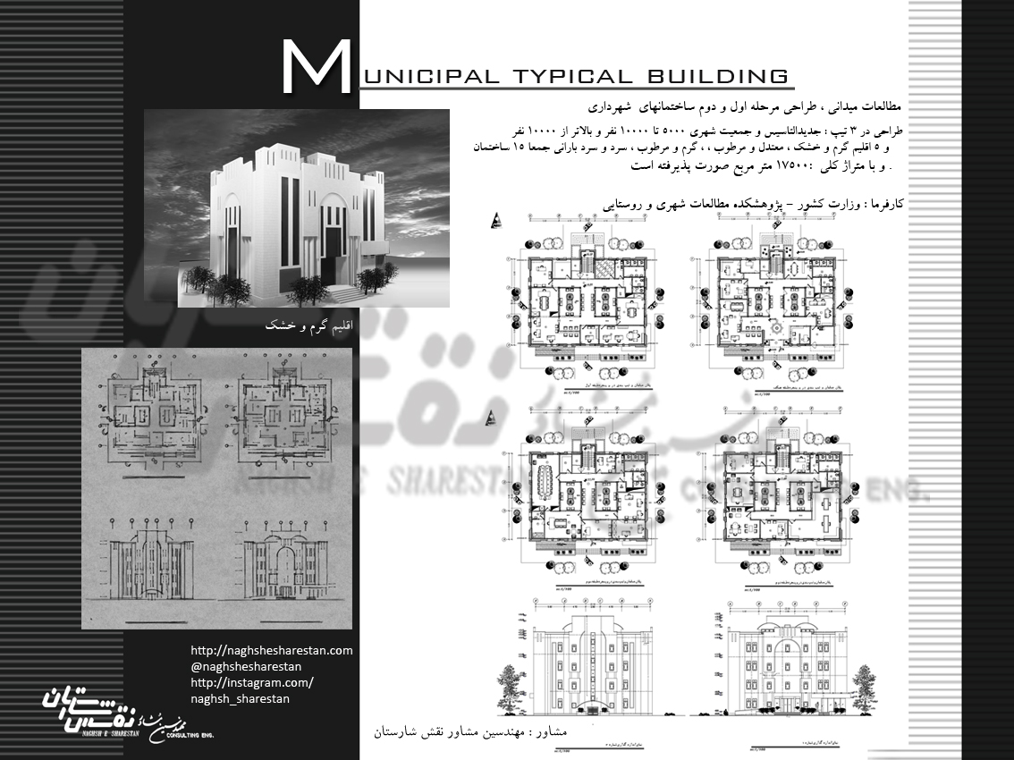 The Dehdari and Municipalities Organization, which is a subdivision of the Ministry of Interior, put the project of designing municipal buildings in cities with a population of 20,000 people in different climates on the agenda of Naghsh Sharestan Consulting Engineers. The problem arose because the Ministry of Interior provided a certain budget to cities that did not have a proper municipal building, and each city was required to build a municipal building with a certain budget, and in the end, some cities used the buildings. And some had progressed from 30 to 70.