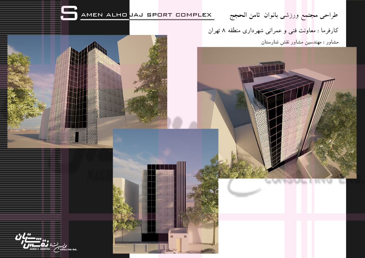 The complex has an area of about 2500 square meters, which is designed on 7 floors and includes various sports spaces such as gym, martial arts gym, aerobics and table tennis, and also on the ground floor includes a dry and steam sauna and There is a pool, jacuzzi and massage room, and includes coffee shop, prayer hall and office space.