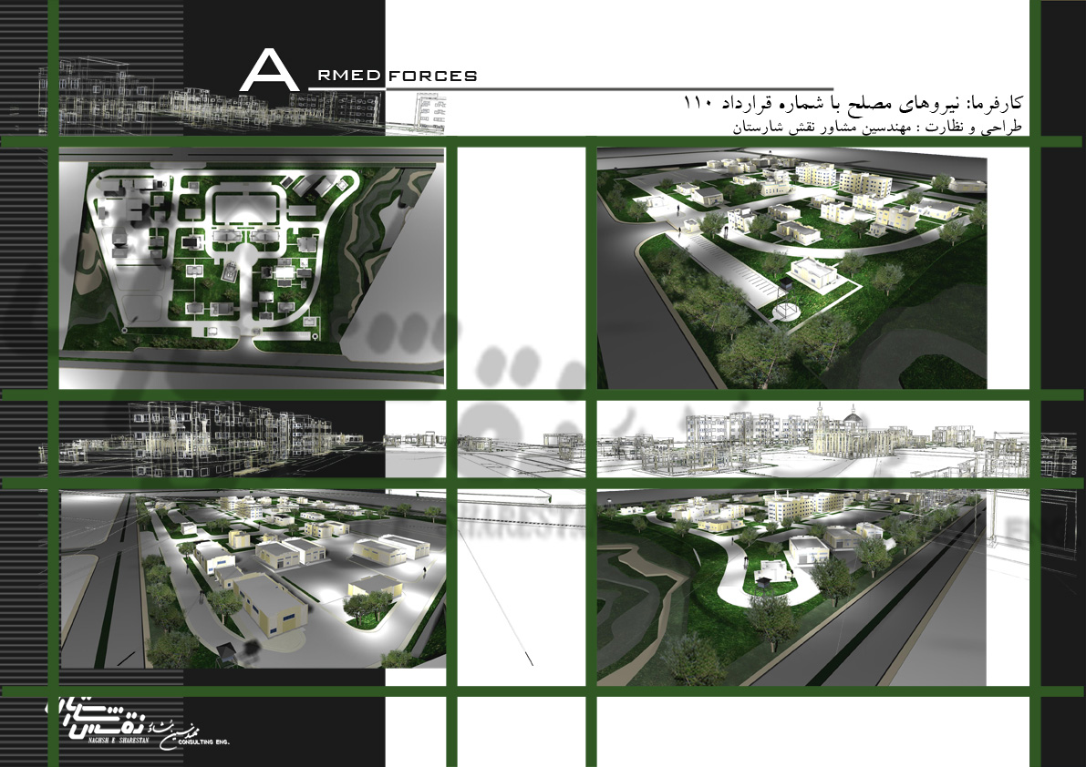 مهندسین مشاور نقش شارستان به دلیل وسعت مناسب سایت ، کلیه جزء فضاهای مورد نیاز کارفرمای محترم را بصورت مستقل و با پراکندگی و فاصله مناسب از هم ، جانمایی و طراحی نموده است . مباحث پدافند غیر عامل و همچنین استتار به درستی و دقت مورد کنترل مضاعف قرار گرفته است . ساختمانها اغلب یک و دو طبقه در نظر گرفته شده است و از لحاظ انواع مصالح و رنگ با ساختمانهای اراضی همجوار هماهنگ است . مساحت کل زمین حدود 116000 متر مربع می باشد و تعداد 40 ساختمان در این زمین طراحی شده است .