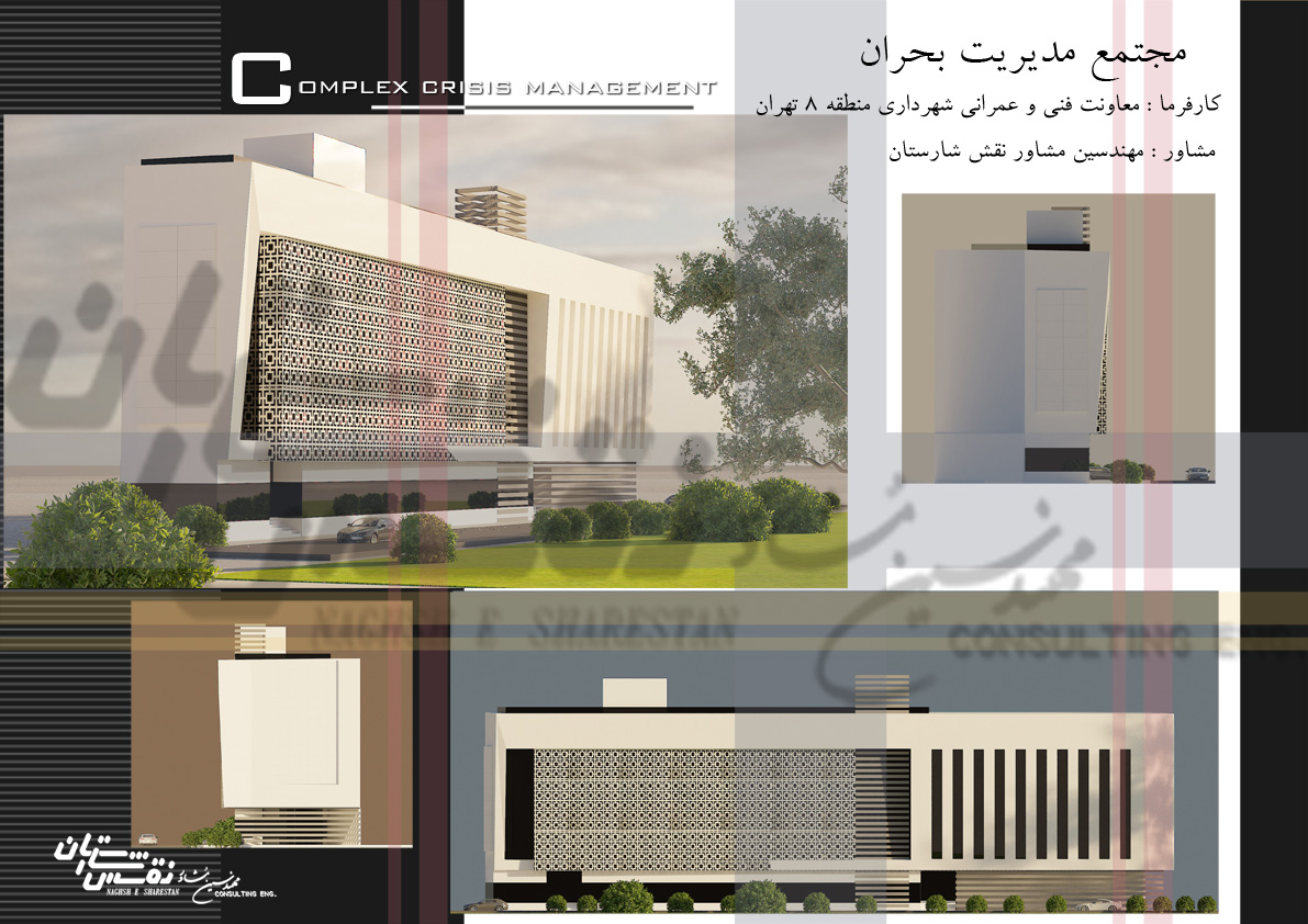 این مجموعه شامل 5 طبقه بوده که پلان این مجموعه در طبقه زیزمین شامل تأسیسات و دو انیار وسیع می باشد .طبقه همکف پارکینگ و بارانداز و انبار و قسمت اداری است .طبقه اول نیز شامل قسمت اداری و انبار و یک سوییت برای افراد مقیم در این مجموعه بوده که بصورت شیفتی حضور خواهند داشت ، است . در طبقه دوم قسمت اداری و محل آموزش مدیریت بحران و در طبقه سوم شامل اتاق جلسات و قسمت اداری است .