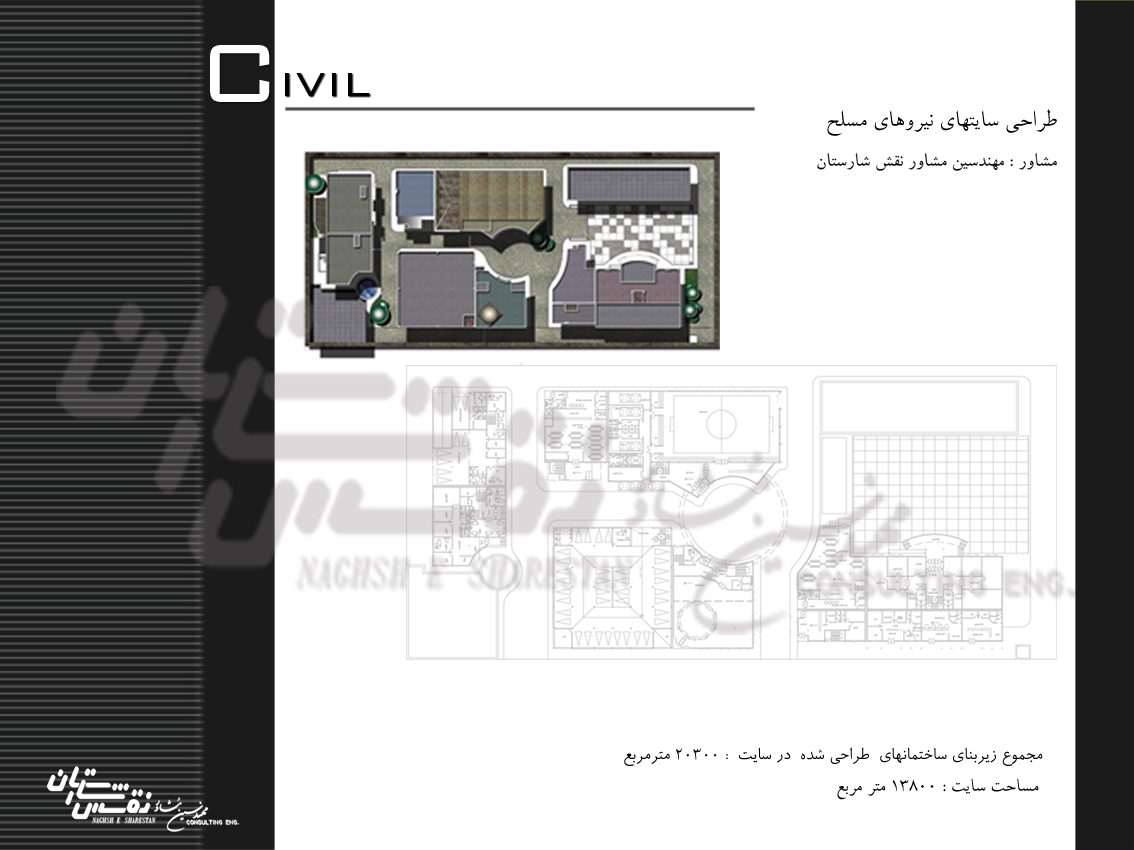 مساحت کل زمین حدود 54000 متر مربع می باشد و تعداد 22 ساختمان در این زمین طراحی شده است .